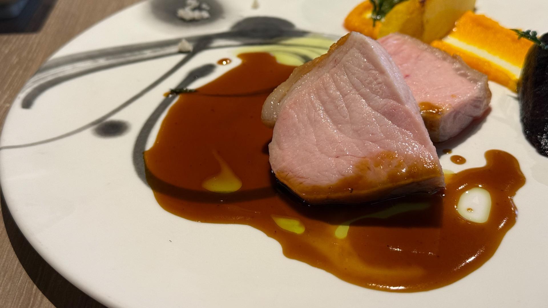 アートのような一皿に、“どこから食べよう?”と、嬉しい悩み。豚は柔らかく、噛むほどに旨味があふれ、ソースと合わせていただくと更に贅沢な一口。付け合わせに人参を使われていましたが、人参の味も甘かったです。