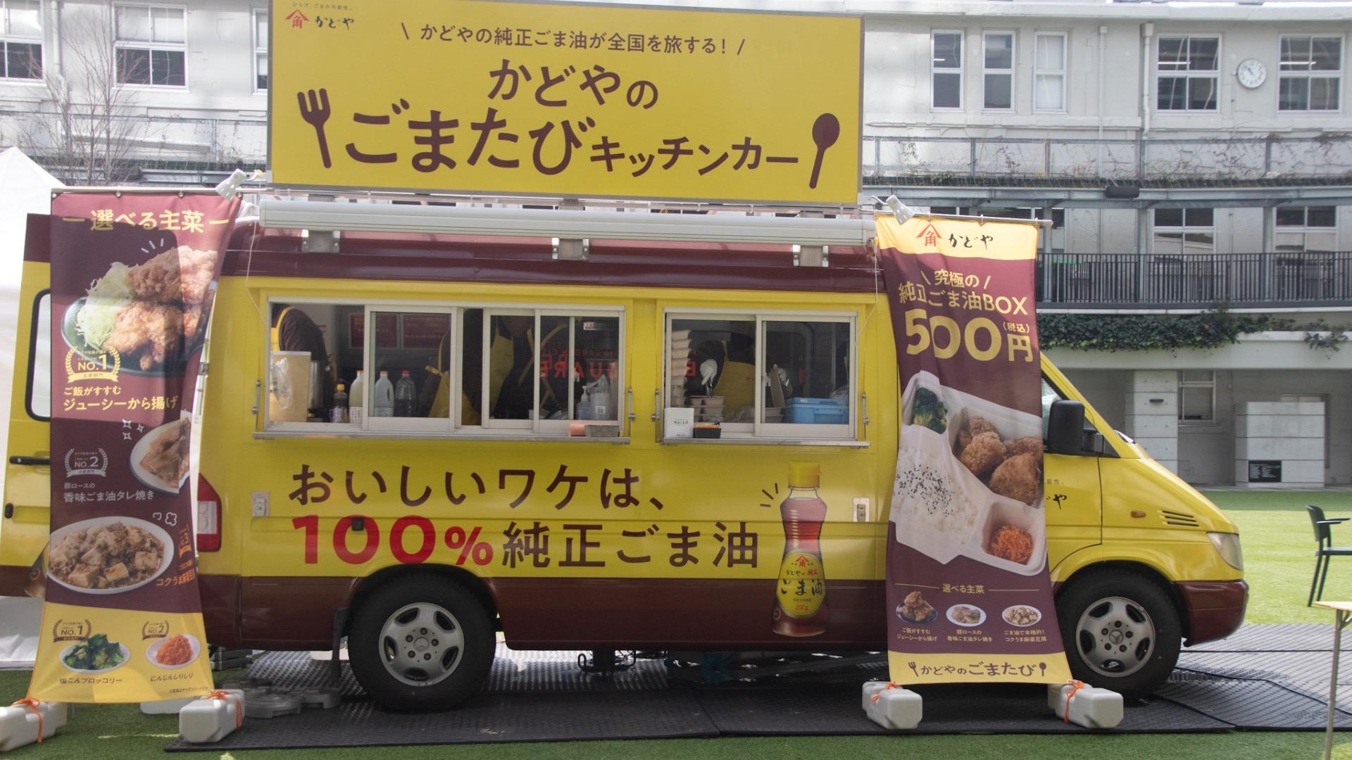かどやの純正ごま油のパッケージ同様の色味のキッチンカーは、お茶目な印象のキッチンカーでした。