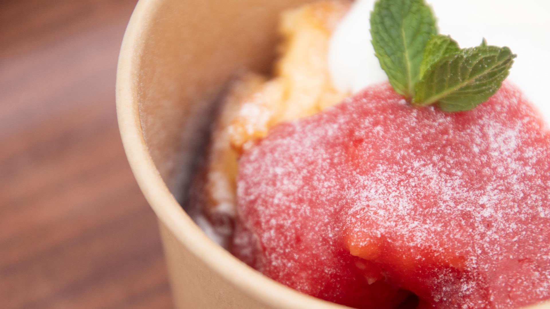 食べると、飲むようにやわらかいフレンチトーストにあまおう苺ソースとホイップがよく合うスイーツ。