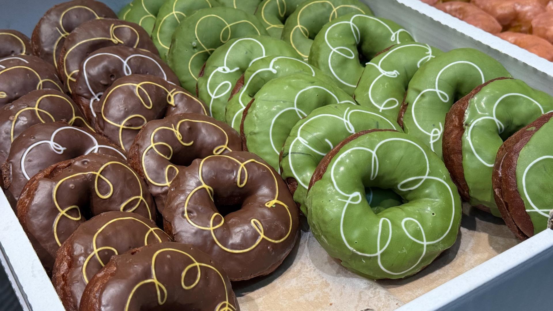 ミルクチョコレートドーナツと並び、ミルクチョコドーナツはチョコのブラウンに対してこの抹茶ドーナツは綺麗な緑色。