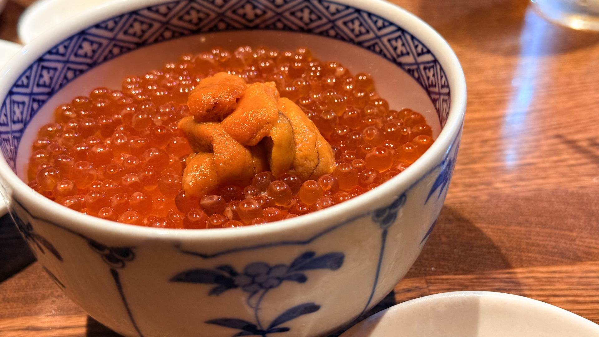 これは、贅沢すぎる丼。醤油漬けされて味が整えられているイクラがたっぷりの丼に、雲丹がのせられたミニ丼です。ミニ丼と言っても割と大きな丼で、ご飯と食べるのが嬉しすぎる料理。
