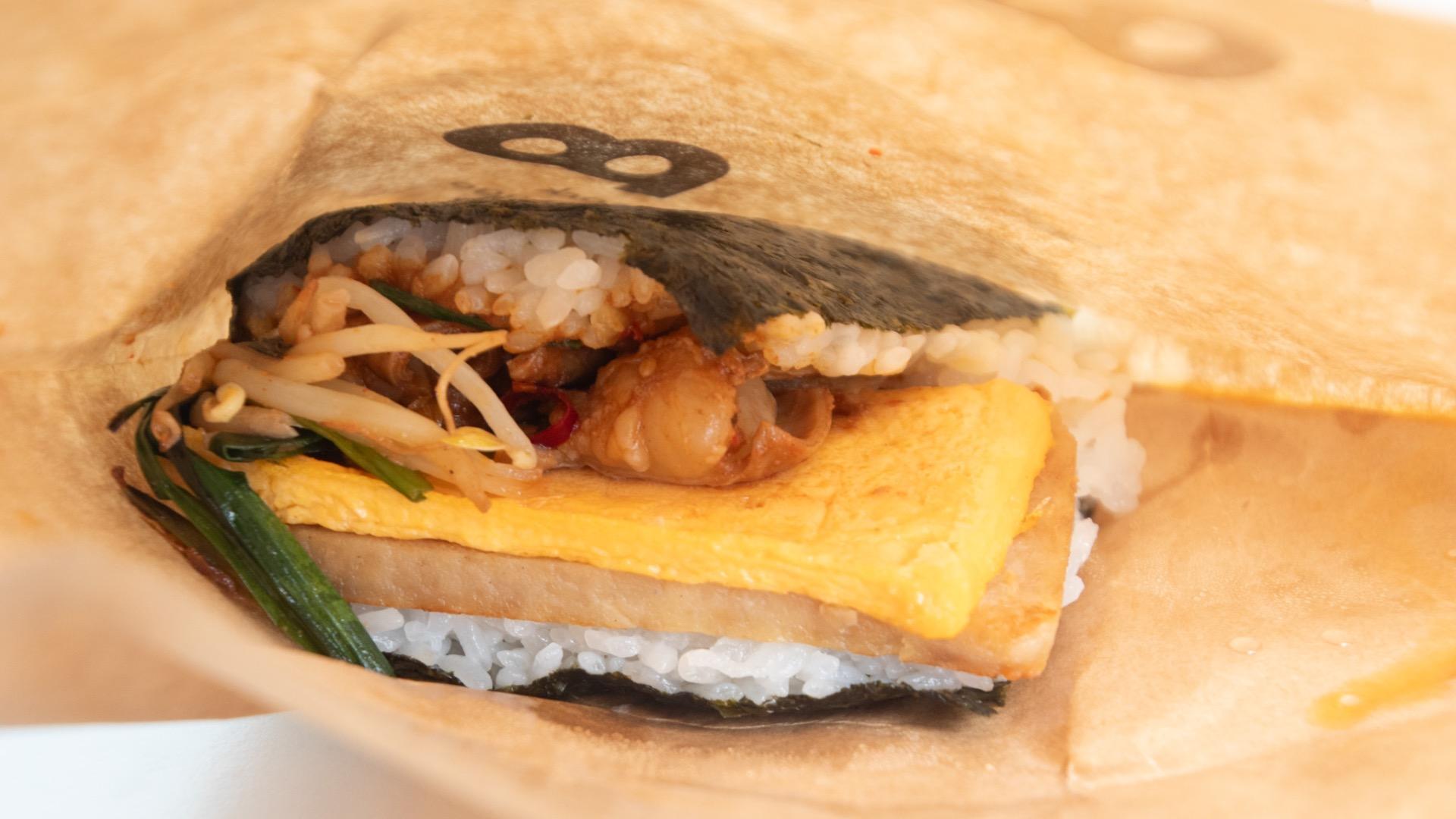 ポークランチョンミートと玉子焼きをご飯と海苔で挟んで頂く、沖縄の家庭料理。