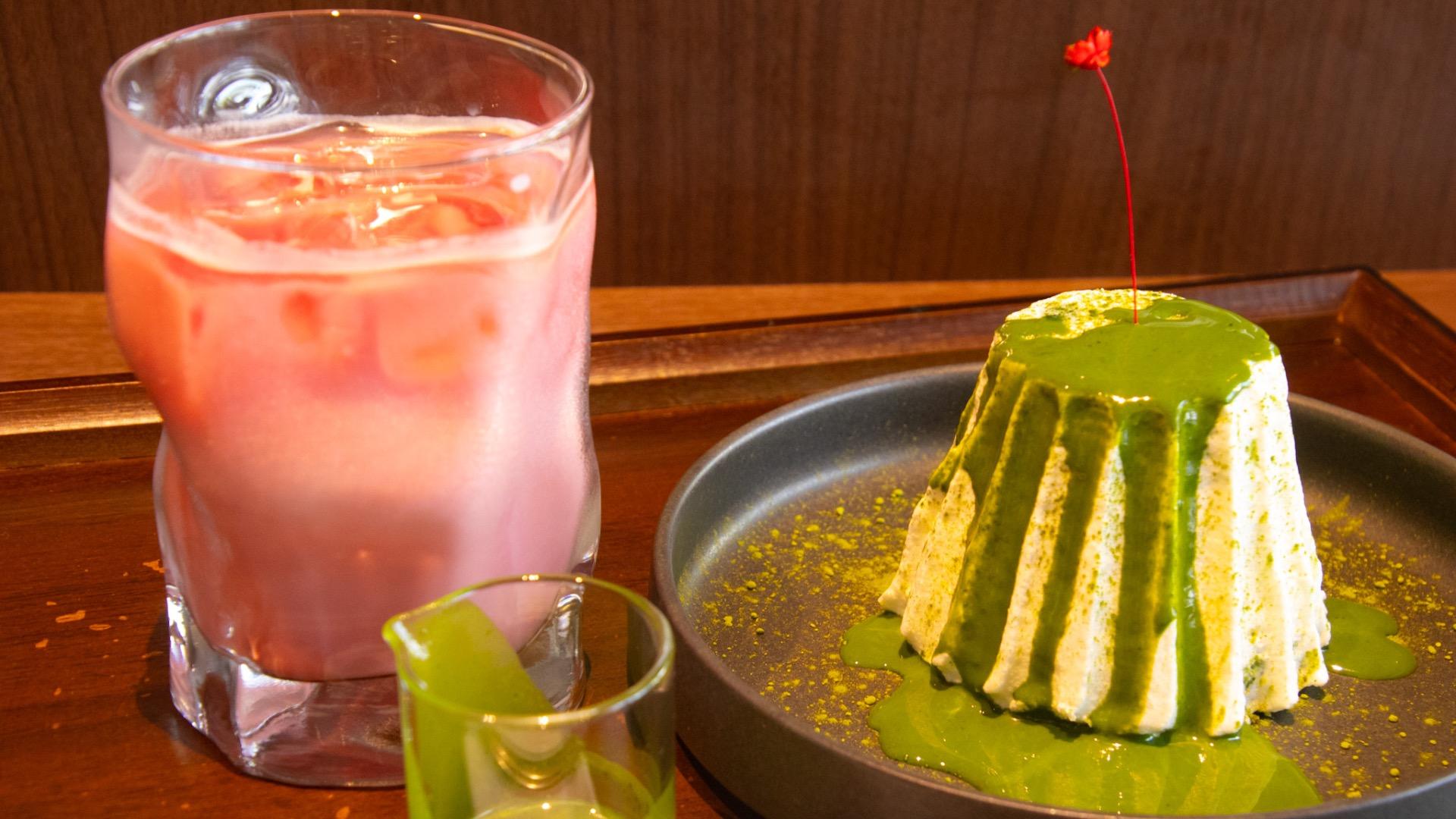 見た目も味も楽しめる、抹茶ケーキとレッドラテ