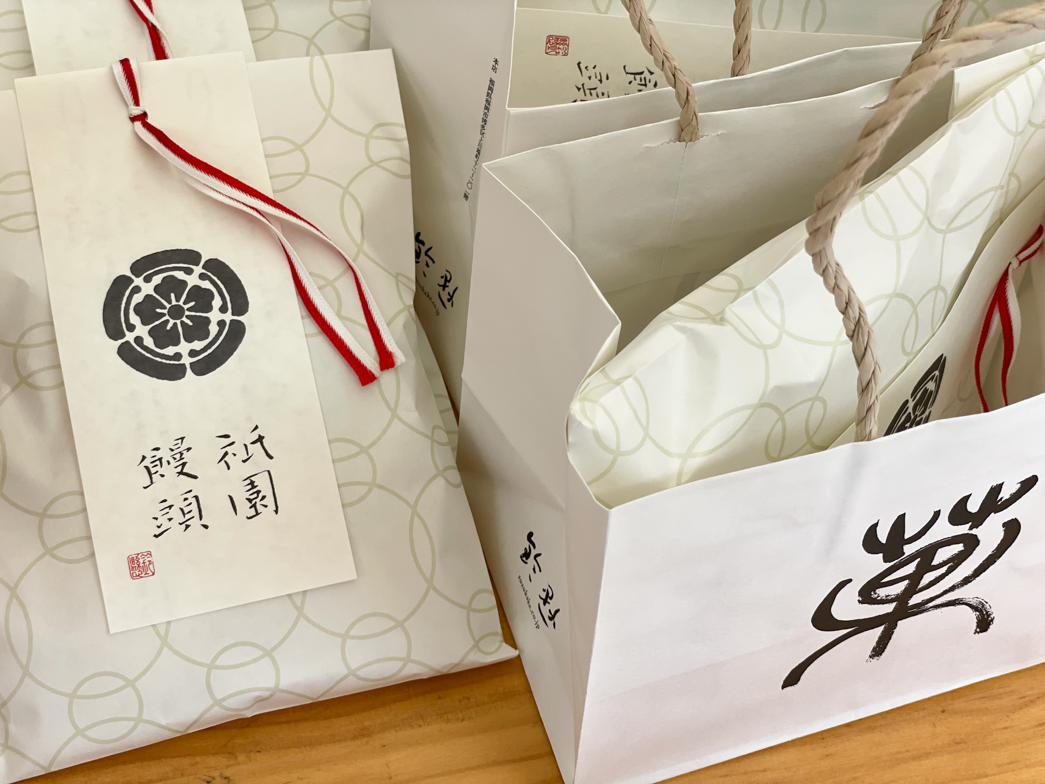 赤と白の紐が映える表面には、櫛田神社の紋と祇園饅頭の文字。