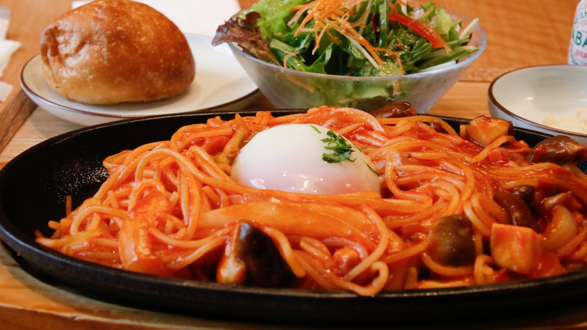 鉄板に入ったたっぷりのナポリタン、中央には温泉卵が今にも流れ出しそうにトロットロ。トッピング用のチーズとタバスコ付き。