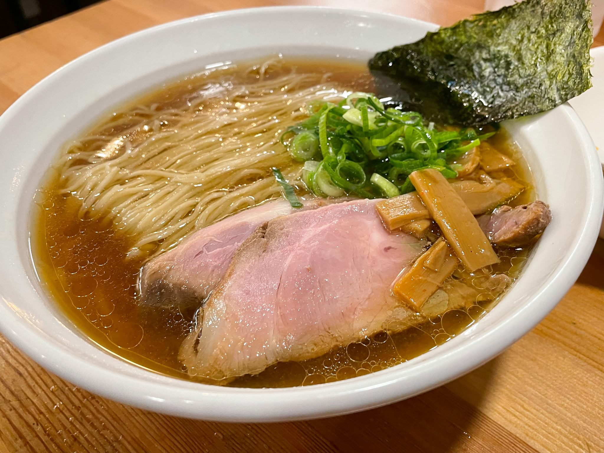 初めての来店で、基本の中華そばを注文しました。ベースは鶏ガラスープ。羅臼昆布や他の乾物と魚介類を合わせた透明のスープに油のキラキラが食欲そそります。