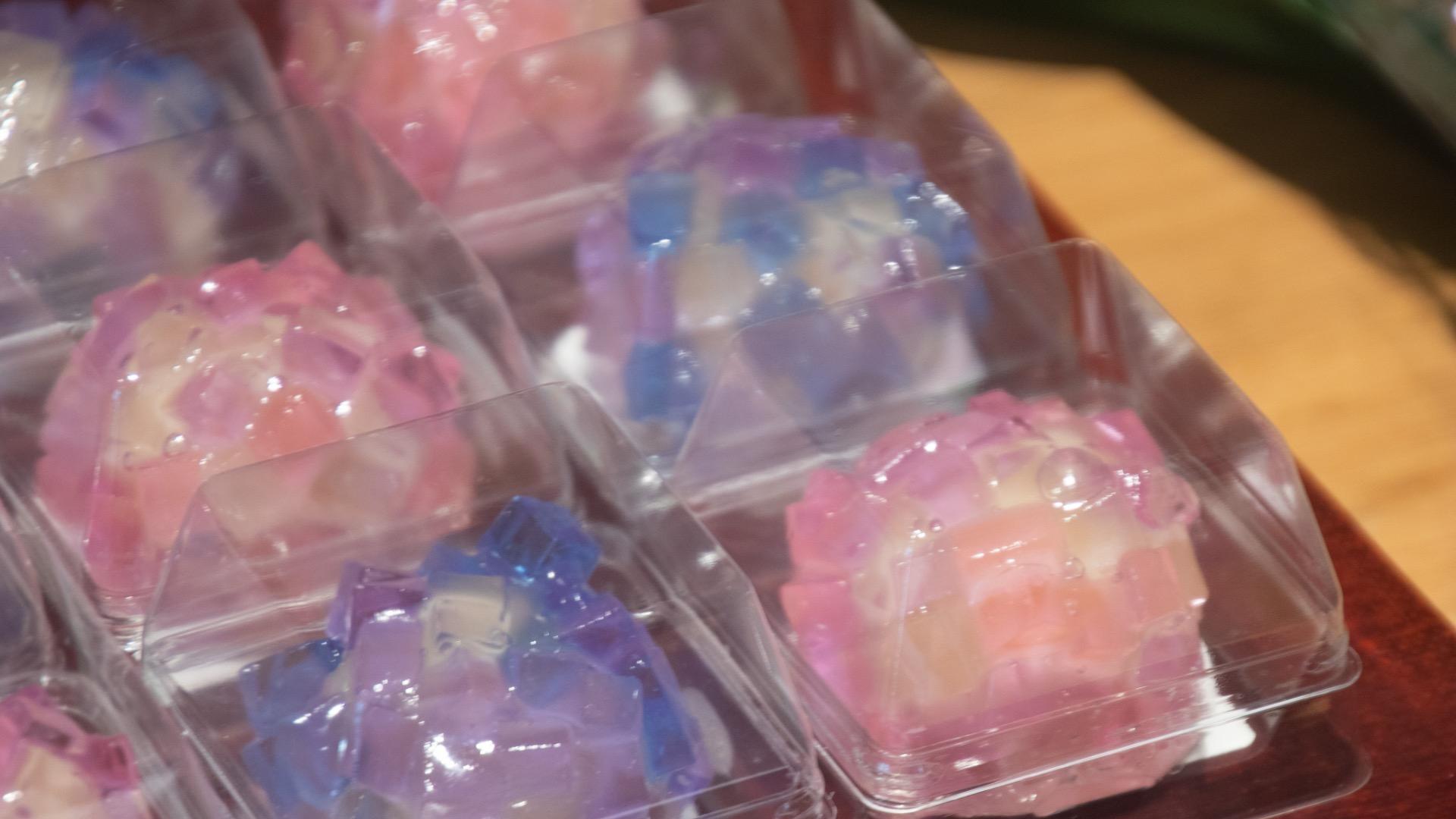 瑞々しく透き通る寒天の中に浮かぶ異なる青と紫の色合いは、まさに雨の季節に咲く本物の紫陽花そのもの。