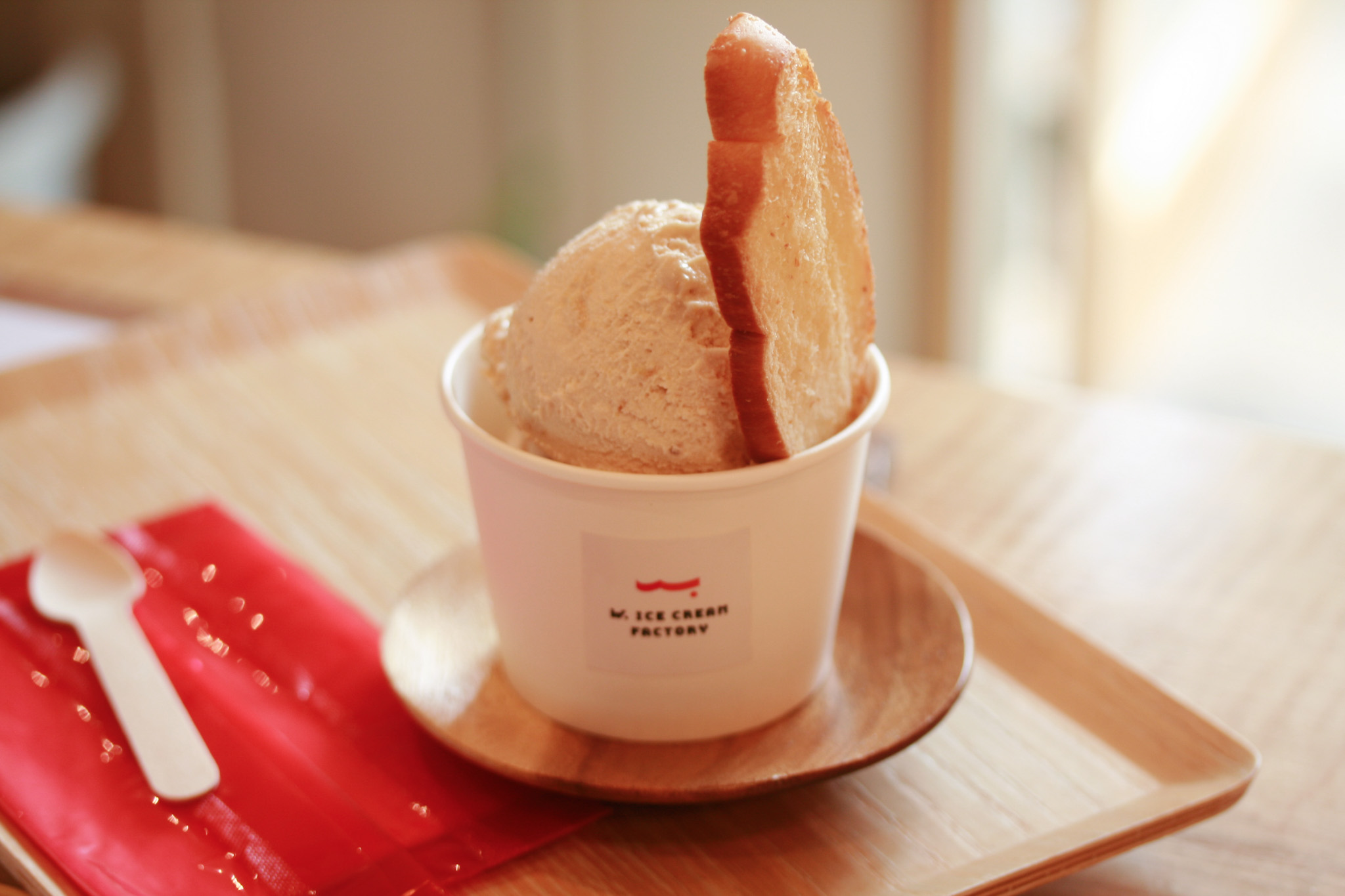 5分も待たずに、トレイにのせて運ばれてきたアイスクリーム。ラスクが縦にトッピングされた、かわいい姿。